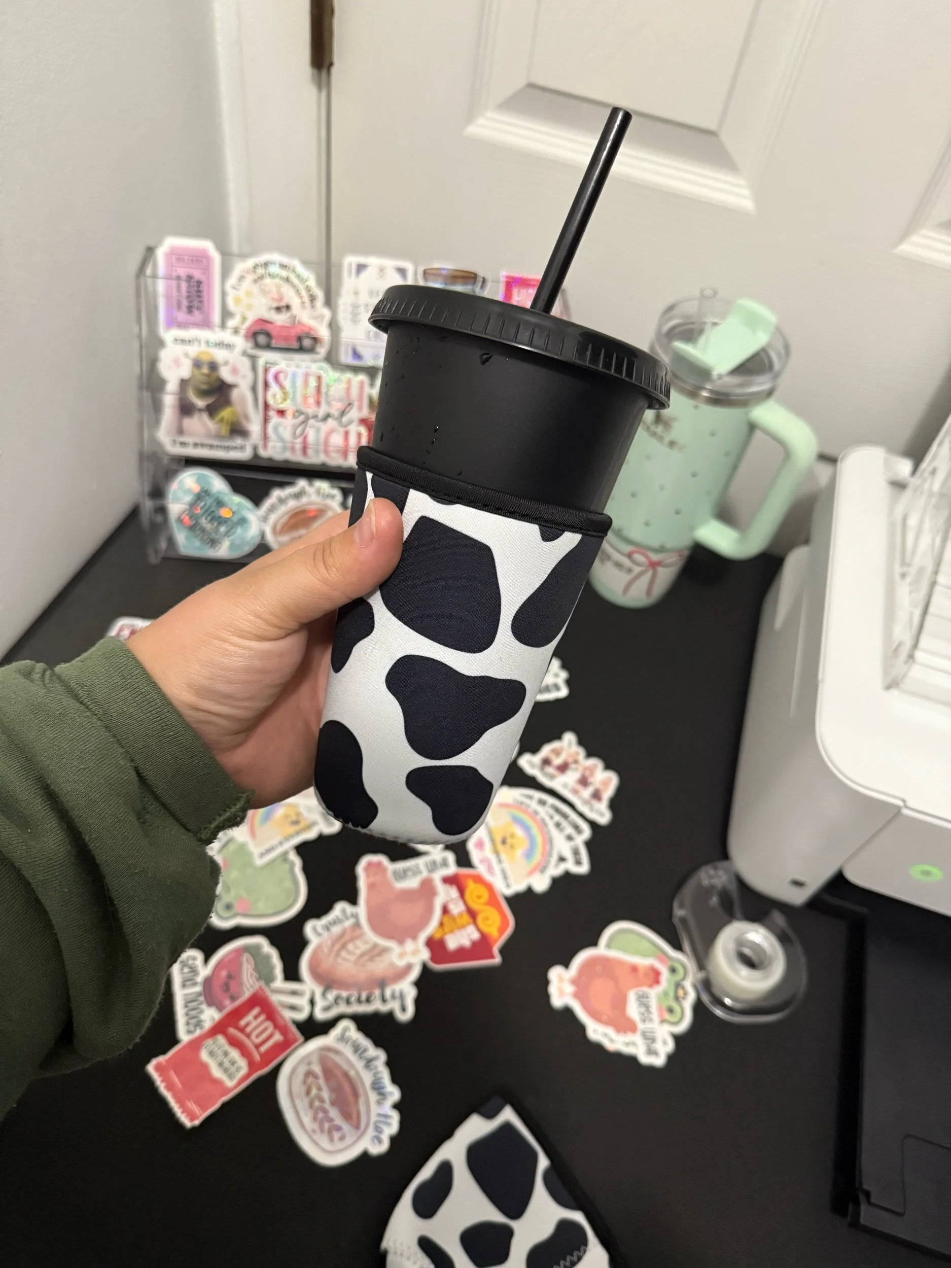 Meet your new favorite cup accessory! This adorable cow-print neoprene sleeve keeps your drink cold, your hands dry, and your vibe extra cute. Perfect for iced coffees, sodas, smoothies, or your daily “I deserve this” treat.